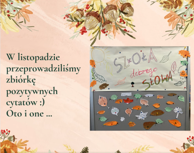 W listopadzie zorganizowaliśmy zbiórkę pozytywnych cytatów, które będą nam ocieplać szare, jesienne dni i wprawiać w lepszy nastrój. Dziękujemy wszystkim za aktywny udział i zachęcamy do poczytania „inspirujących listków” w wolnym czasie:) Bo … słowa mają MOC!