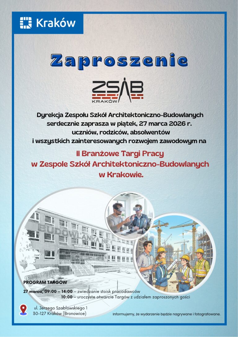 W imieniu Pani Dyrektor Zespołu Szkół Architektoniczno-Budowlanych Doroty Matlęgi, serdecznie zapraszamy w piątek 27 marca 2026 r. uczniów, rodziców, absolwentów i wszystkich zainteresowanych do czynnego udziału w II Branżowych Targach Pracy. Przewidujemy czas trwania Targów 27 marca od godz. 9.00…