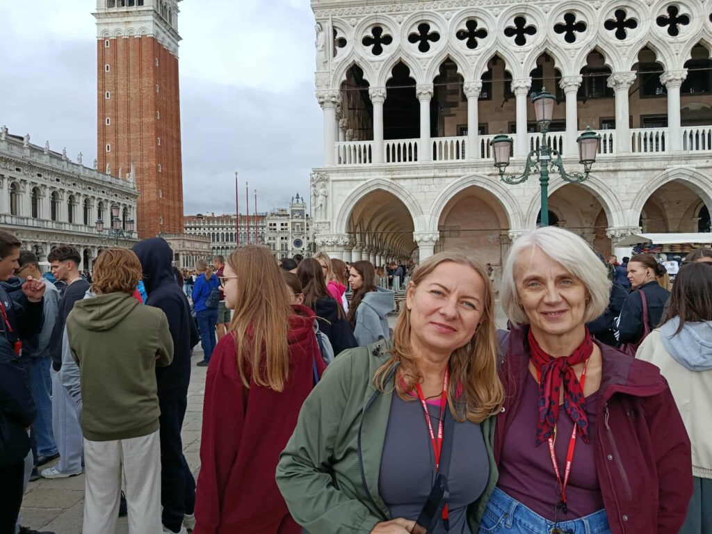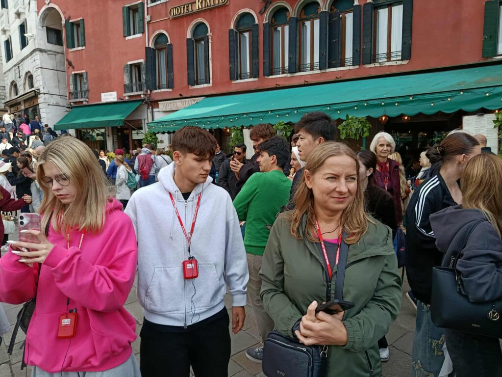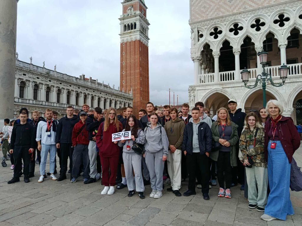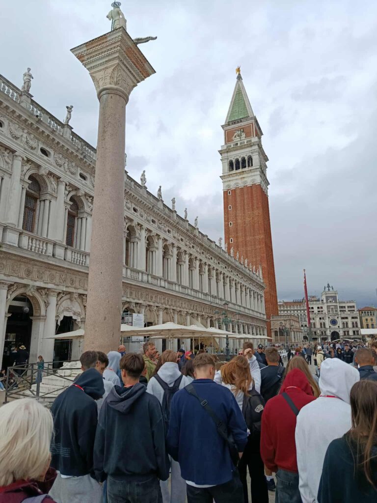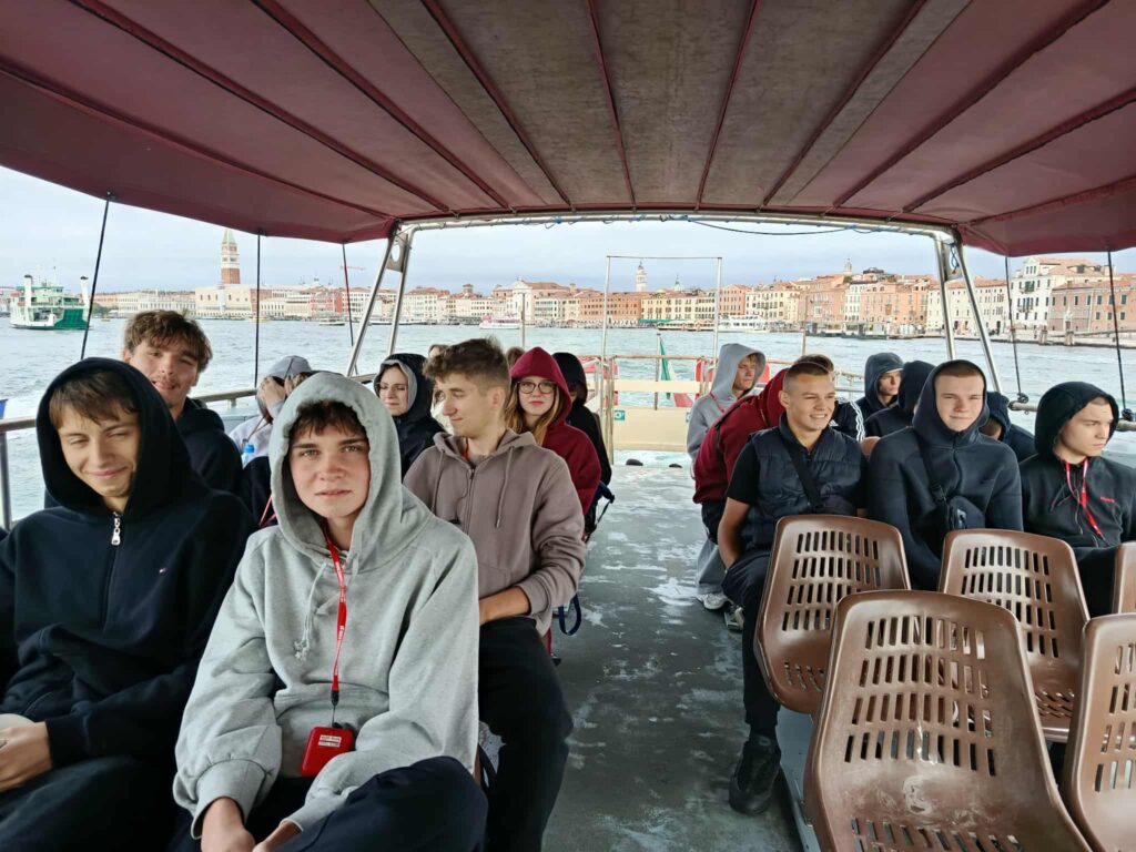 Następnie uczestnicy wycieczki popłynęli promem do historycznego centrum Wenecji, aby zobaczyć jej największe atrakcje. Spacer rozpoczął się na Placu św. Marka – sercu miasta, otoczonym zabytkowymi budowlami. Uczniowie podziwiali majestatyczną Bazylikę św. Marka z bogato zdobioną fasadą oraz imponującą dzwonnicę (Campanile). Podczas spaceru po wąskich uliczkach i licznych mostach Wenecji uczniowie mogli poczuć wyjątkowy klimat tego miasta zbudowanego na wodzie. Zobaczyli także słynny Most Westchnień, Pałac Dożów oraz liczne kanały, po których pływają tradycyjne gondole.
