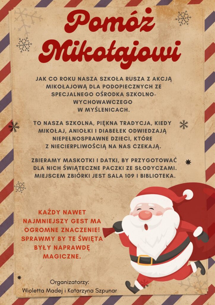 Od ponad 40 lat nasza szkoła organizuje Akcję Mikołajową dla podopiecznych Specjalnego Ośrodka Szkolno-Wychowawczego w Myślenicach.