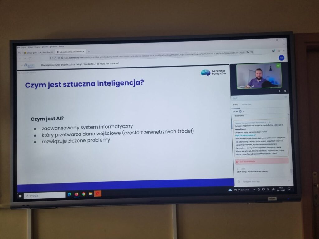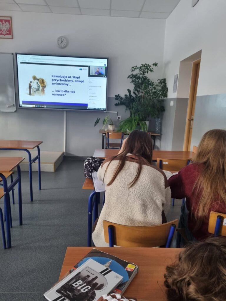 Dzisiaj 24 listopada 2025r. klasa II AbK brała udział w ogólnopolskiej lekcji „Rewolucja AI” w ramach projektu edukacyjnego BAKCYL, którego organizatorem jest Warszawski Instytut Bankowości.