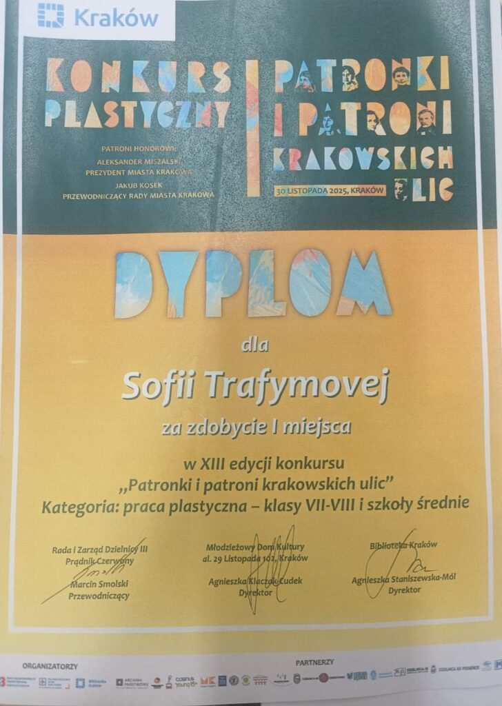 Sofii Trafymova z klasy III R/W zdobyła I miejsce w XIII edycji konkursu ,,Patronki i patroni krakowskich ulic”.