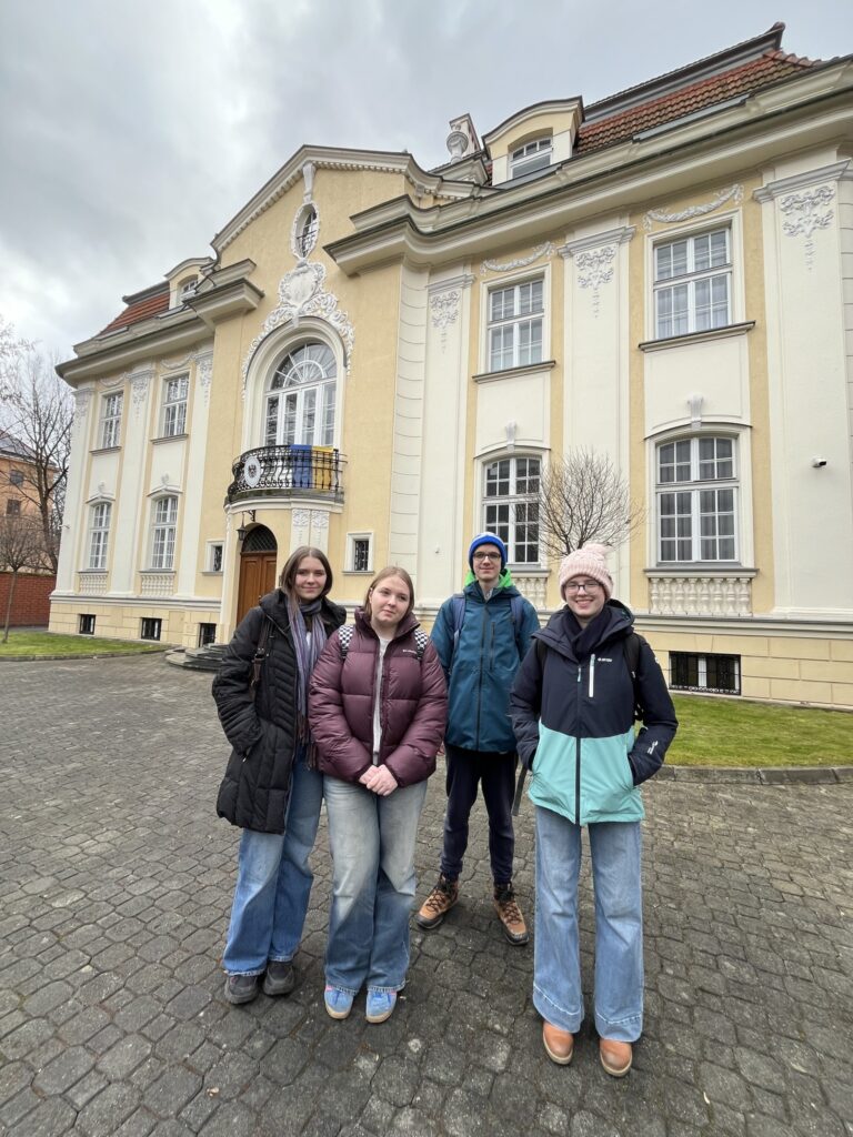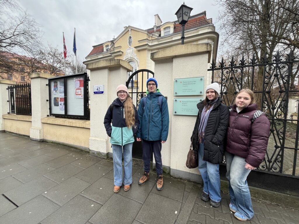 Po wizycie w bibliotece udaliśmy się spacerem ulicą Krupniczą do siedziby konsulatu, gdzie zostaliśmy oficjalnie powitani. Asystent Pana Konsula Generalnego przybliżył nam najpierw ciekawostki dotyczące działalności placówki oraz samej Austria, a następnie zaprosił uczestników do udziału w quizie z atrakcyjną nagrodą rzeczową. Nasi uczniowie bezbłędnie odpowiedzieli na wszystkie pytania – nawet te najbardziej wymagające – czym wywarli ogromne wrażenie na pracownikach konsulatu. Serdecznie gratulujemy!