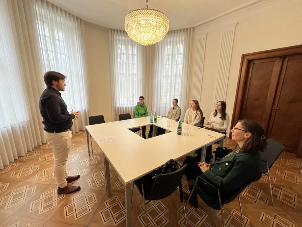 W drugiej części spotkania młodzież miała zaszczyt osobiście poznać Pana Konsula Generalnego, Martina Gärtnera. W kameralnej atmosferze uczniowie zdobyli wiele interesujących informacji na temat pracy w dyplomacji oraz ścieżki zawodowej naszego gospodarza. Pan Konsul, który biegle posługuje się pięcioma językami, a trzy kolejne zna w stopniu podstawowym, mile zaskoczył nas również bardzo dobrą wymową w języku polskim.