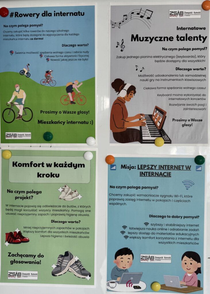 Autorzy i autorki projektów w Internacie Zespół Szkół Architektoniczno-Budowlanych zadbali o to, aby na każdym plakacie oprócz opisu projektu, znalazła się informacja, dlaczego warto głosować właśnie na ten konkretny pomysł