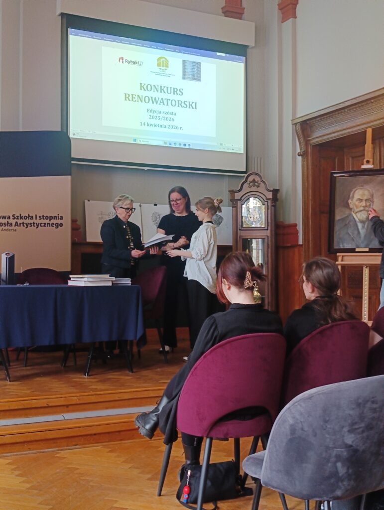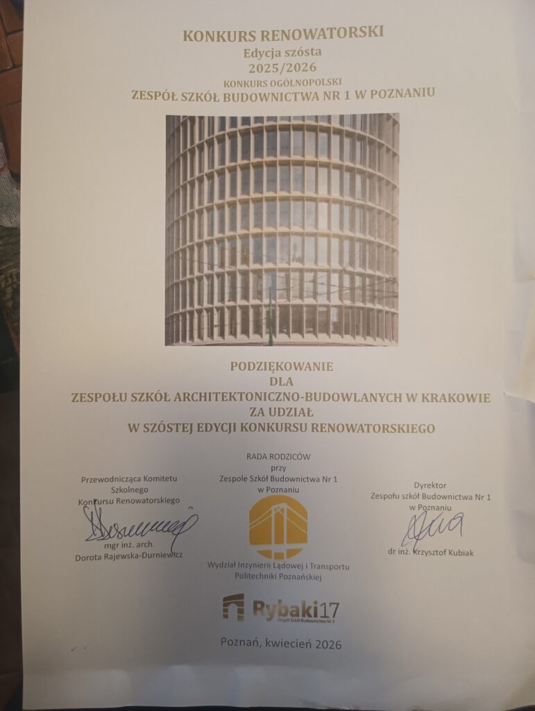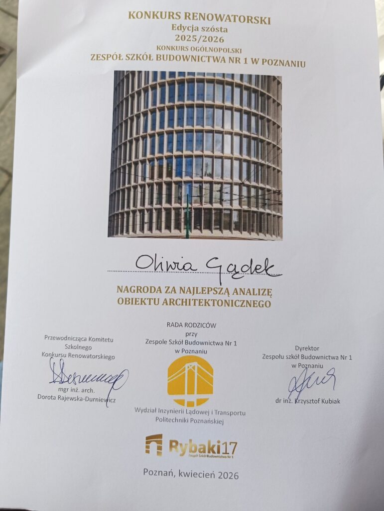 14 kwietnia 2026r., pierwszy raz nasi renowatorzy brali udział w VI już edycji Konkursu Renowatorskiego, który odbył się w Zespole Szkół Budownictwa nr 1 w Poznaniu. W zadaniach konkursowych brali udział uczniowie z 16-stu szkół z całej Polski o profilu Technik elementów architektury. Naszą szkołę reprezentowały uczennice z klasy III R: Oliwia Gądek i Sofii Trafymova pod opieką nauczyciela zawodu Ewy Nowak-Depta. Z wielką radością informujemy o zdobyciu nagrody za najlepszą analizę obiektu architektonicznego przez naszą reprezentantkę Oliwie Gądek. Gratulujemy i trzymamy kciuki za dalsze sukcesy!!!!