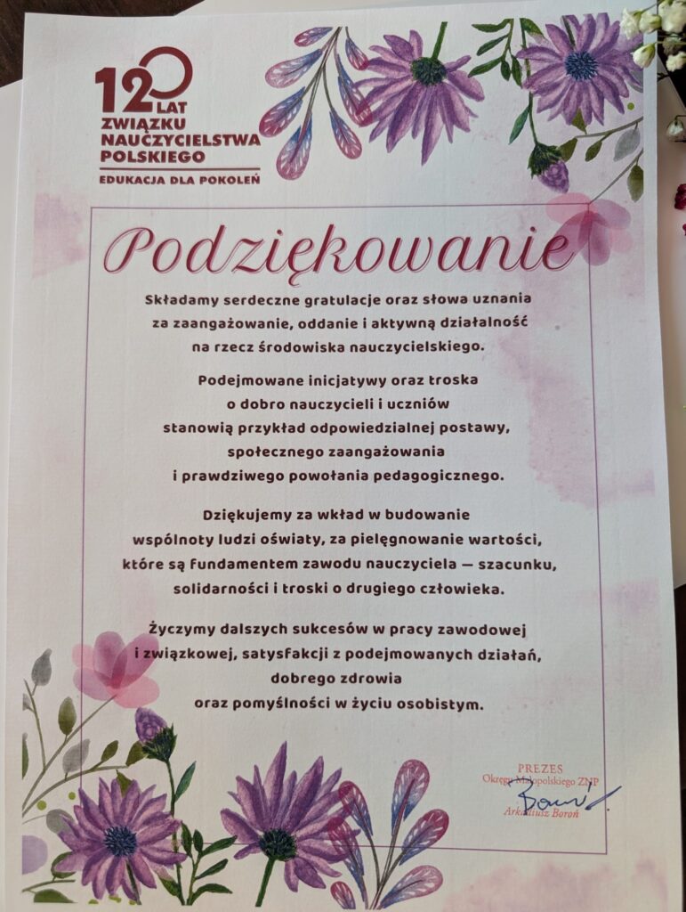 Podziękowania od Związku Nauczycielstwa Polskiego (ZNP)