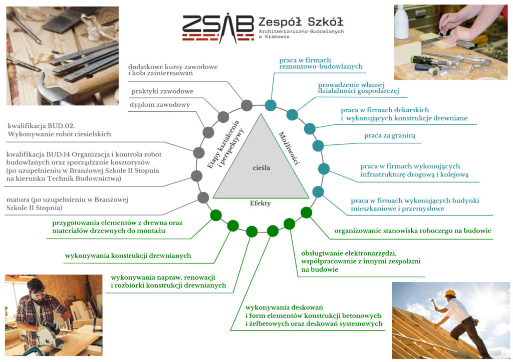 Cieśla to specjalista od konstrukcji drewnianych – buduje więźby dachowe, domy szkieletowe i różne elementy architektury z naturalnego materiału. To zawód dla osób praktycznych, które lubią pracę rękami, widzą szybkie efekty swojej pracy. Dobrzy cieśle są stale poszukiwani na rynku budowlanym, a zdobyte umiejętności pozwalają również na wyjazdy zarobkowe i prowadzenie własnej firmy. Jeśli cenisz konkretne umiejętności, pracę na świeżym powietrzu i zawód z przyszłością – cieśla to świetny wybór.