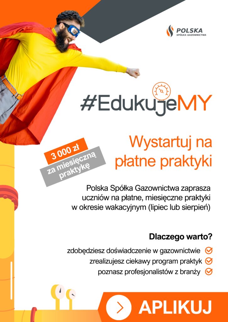 Zdobądź razem z nami doświadczenie !! Zapraszamy uczniów naszej placówki będących na kierunku technik inżynierii sanitarnej do udziału w płatnych praktykach organizowanych przez firmę Polska Spółka Gazownictwa. Wszystkie zainteresowane osoby prosimy o bezpośredni kontakt lub przez dziennik elektroniczny z Panią…